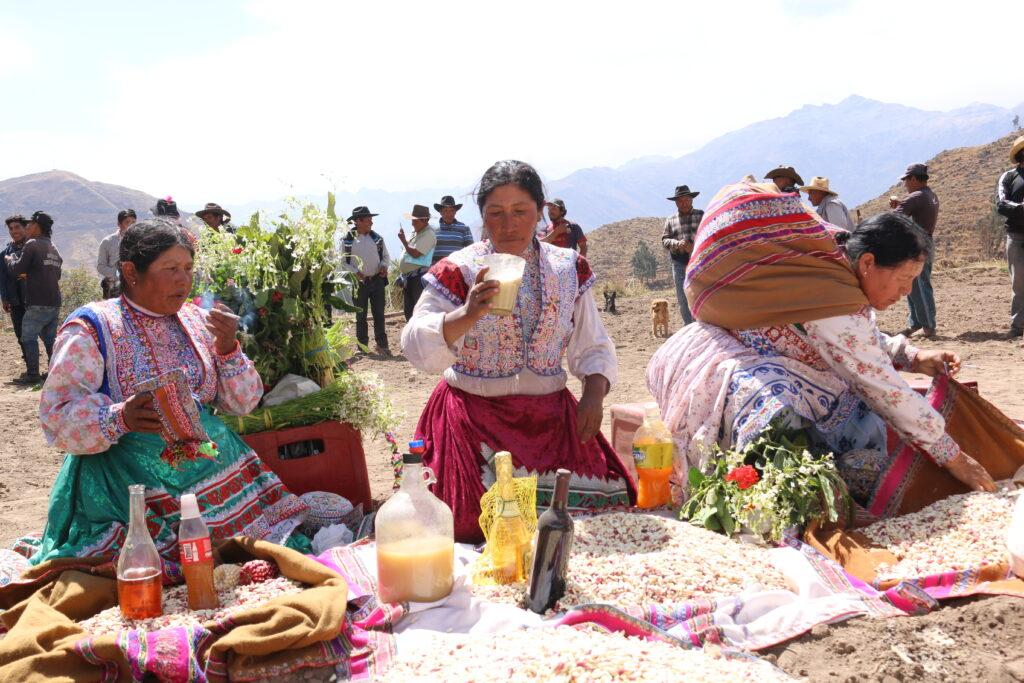 Hombres y mujeres, guiados por la música y el aroma del incienso, ofrecen chicha a la Pachamama, piden permiso al apu Hualca Hualca y se arrodillan en el Mujo Tinkay para que la semilla germine con alegría y se multiplique en cada terreno de la gente y de los santos. Entonces el maíz vuelve a nacer, recordando que es necesario el abrigo y la buena voluntad de trabajar juntos.