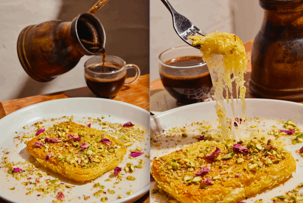 Ezzem. Para postres, prueben el knafeh (pastel de fideos relleno de queso mozzarella fresco, almíbar y pistachos triturados).