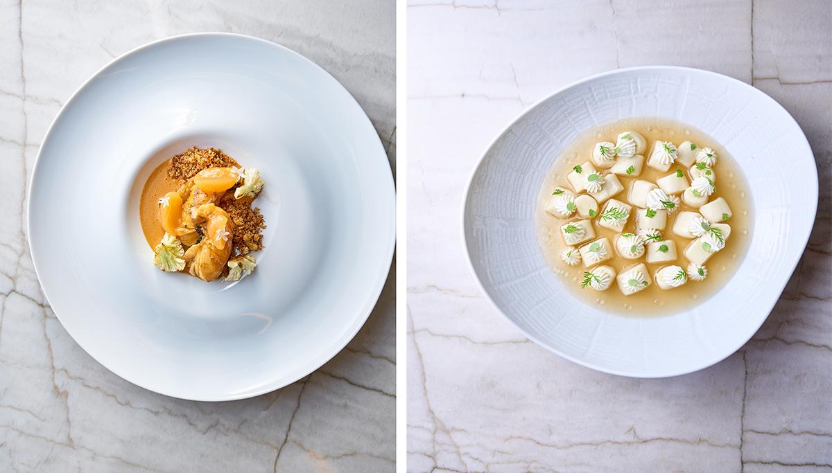 Nelita. Izquierda: langosta, bisque, melón. Derecha: ñoquis, ricotta, parmesano / Foto: Estúdio Mió.