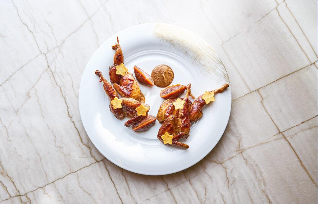 Pasamos directamente a la codorniz dorada con chocolate y cebollas. La estrella de la noche, un homenaje o, quizá, una provocación consciente al legado de Auguste Escoffier. Se sirve un muslo de codorniz con una salsa ligeramente amarga de chocolate, acompañado de cebollas tostadas, y se termina en mesa con un polvo dorado de cebollas. Una combinación intensa, terrosa y profunda. Lleva consigo historia y resignificación del poder femenino frente a los fogones, algo que en su momento fue negado, ya que el sistema de trabajo que impuso Escoffier ayudó a institucionalizar un modelo con fuerte presencia masculina en la alta cocina, excluyendo a las mujeres a ese nivel profesional. Los tiempos cambian, y esta es la respuesta a ese clásico.