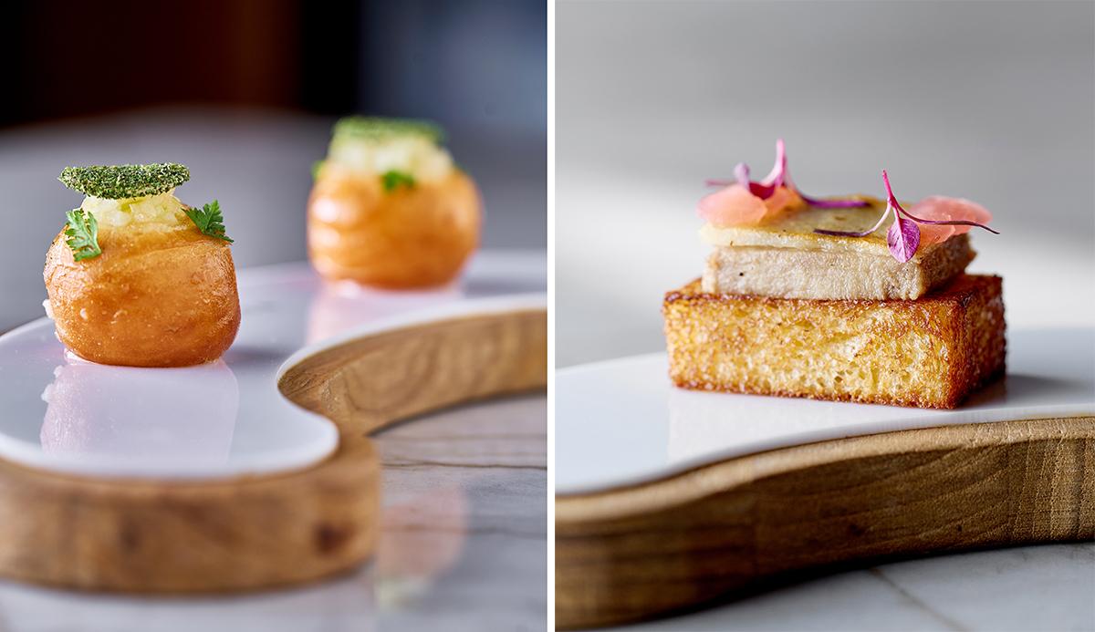 Nelita. Izquierda: beignet con pimienta, vinagreta de verdes. Derecha: tostada francesa con lengua y papa / Foto Estúdio Mió.
