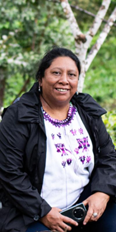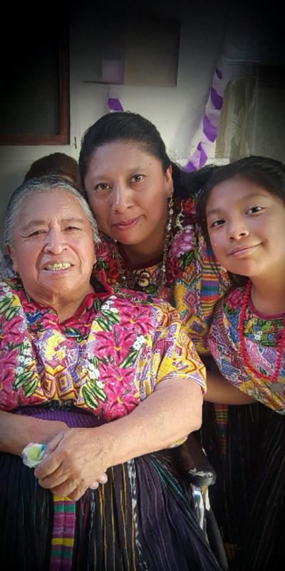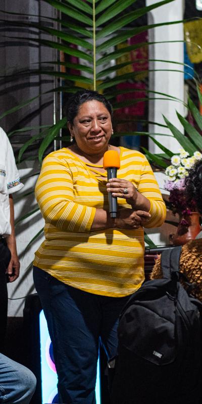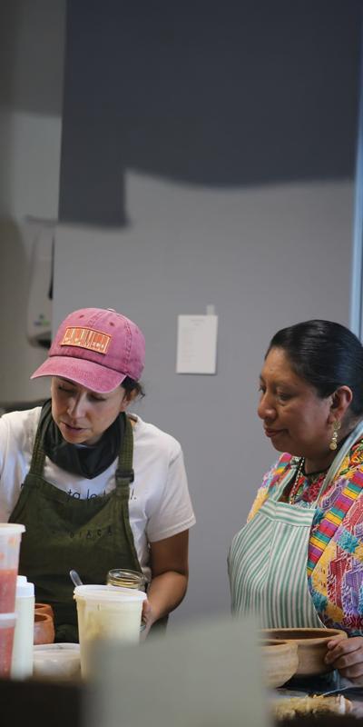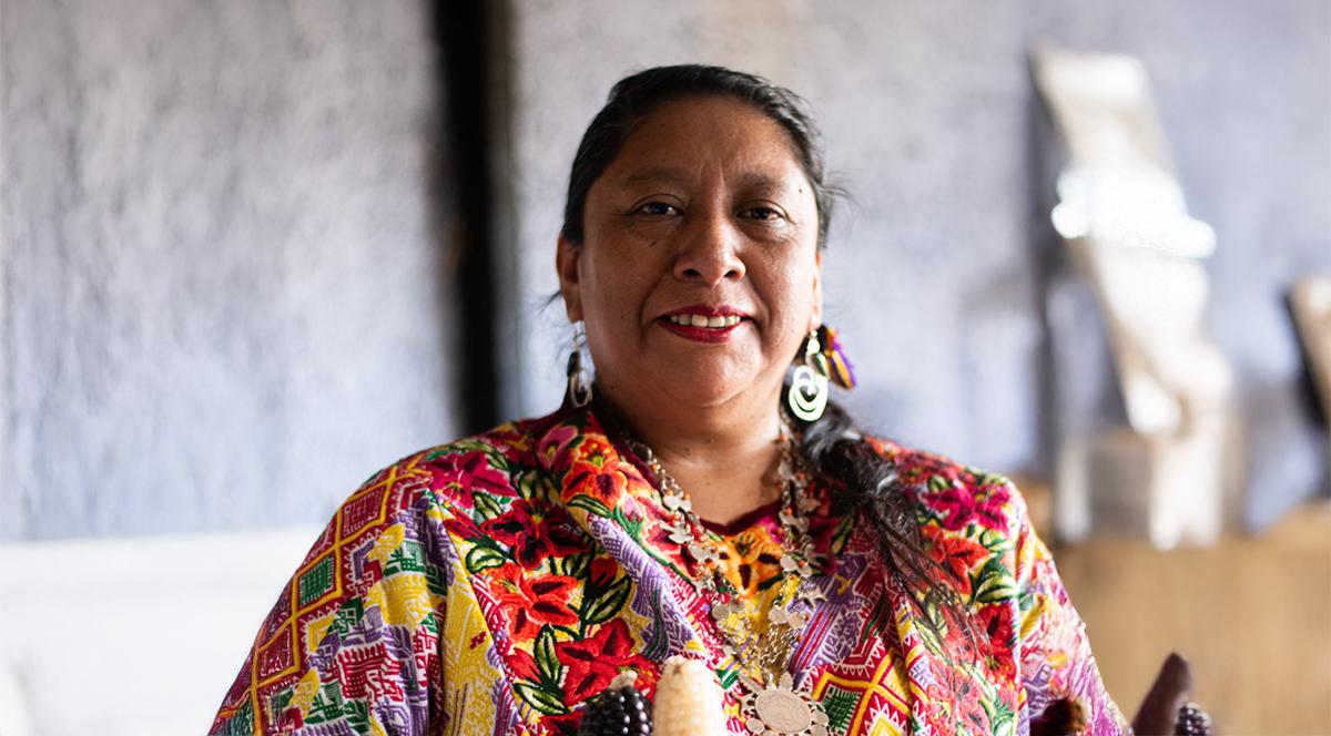 Vestida en elegante traje multicolor, propio de su cultura ancestral maya k’iche’, esta cocinera guatemalteca transmite con orgullo la sabiduría de su cocina originaria.