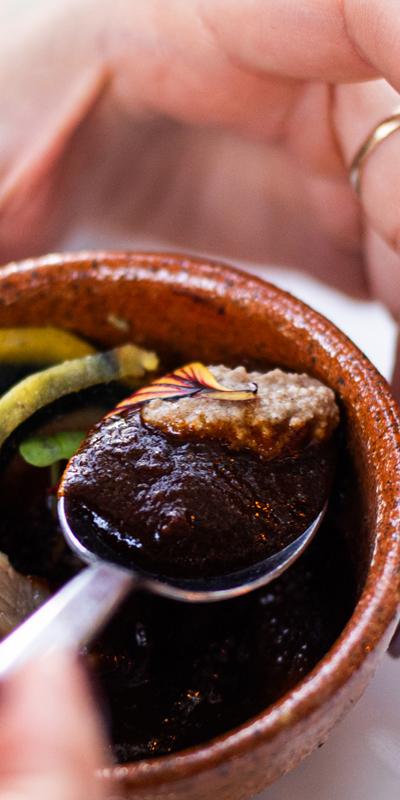 Así fue como el legado y la fama de doña Julia pasó a las manos de Chaíto, quien abrió su restaurante Rkil Wa después de pandemia, pero años antes tuvo un servicio de catering. La gente decía “pedirle a la hija de doña Julia es como pedirle a doña Julia, ¿no?”, y era cierto: siguiendo la costumbre de recetas antiquísimas, Chaíto prepara los tamales de arroz, los pachés de papa con recado verde, hasta vendía garnachas, pequeñas tortillas fritas montadas con carne, repollo y salsa, un clásico de la comida callejera local y también del sur de México. También esa versión suya del quichom, un delicioso recado espeso a base de chiles y chancho, que es tradicional de ceremonias especiales y, por ello, patrimonio culinario de Quetzaltenango; lo probamos con panceta marinada en cacao en el evento Manos en la Masa, celebrado en la ciudad de Antigua.