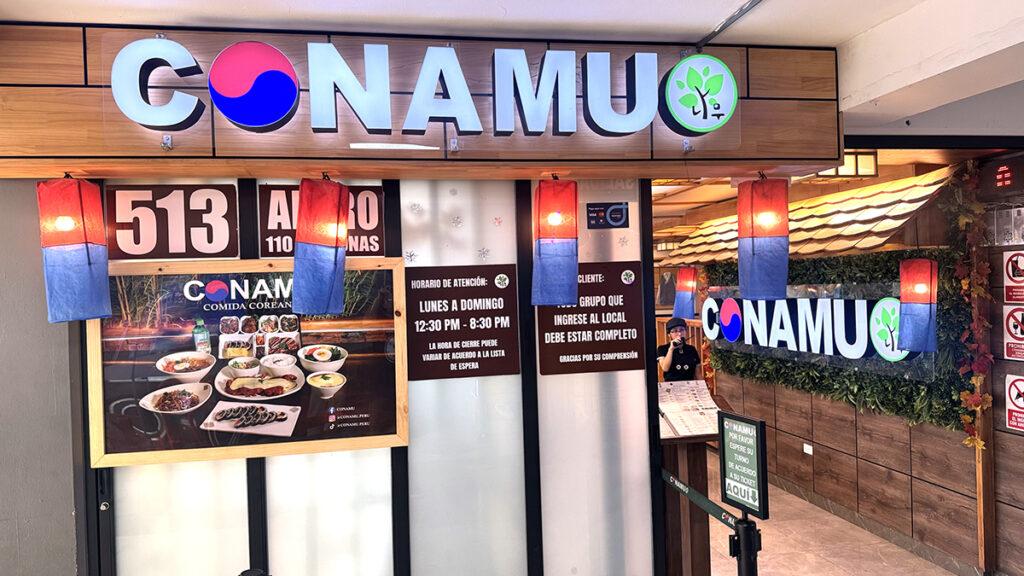 En este paisaje aparecen dos restaurantes coreanos que funcionan como puntos de ancla. Conamu, con sus dos locales en el primero y quinto piso, plantea una experiencia directa, casi esquemática. El formato recuerda al dosirak: una bandeja que ordena el plato, separa componentes y permite combinaciones según el ritmo del comensal. Se trata de una bandeja que remite a una lonchera típica surcoreana con acompañamientos variados: arroz, donkatsu (milanesa de cerdo al estilo asiático), kimbap (rollos de arroz, como makis pero coreanos), pollo dulce, kimchi bokkeumbap (arroz frito, parecido a nuestro chaufa, pero picante), japchae (fideos de camote salteados con verduras y sazonados con salsa de soya y aceite de sésamo), siempre acompañadas con salsas que conviven en un mismo espacio físico y conceptual. Es una propuesta pensada para quien se sienta, come y vuelve al recorrido sin demasiadas interrupciones. También ofrecen kasu (platos a base de carne de pollo o cerdo apanado), con arroz y ensalada; dobap (platos con carnes vegetales servidos sobre arroz) y el ramyeon (la versión coreana del ramen japonés).