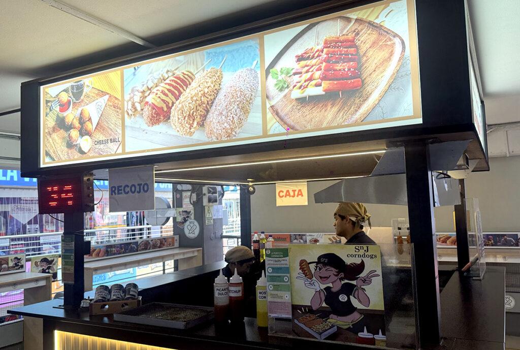 C.C. Arenales. El corn dog se presenta ya atravesado por la reinterpretación coreana, con textura y rellenos.