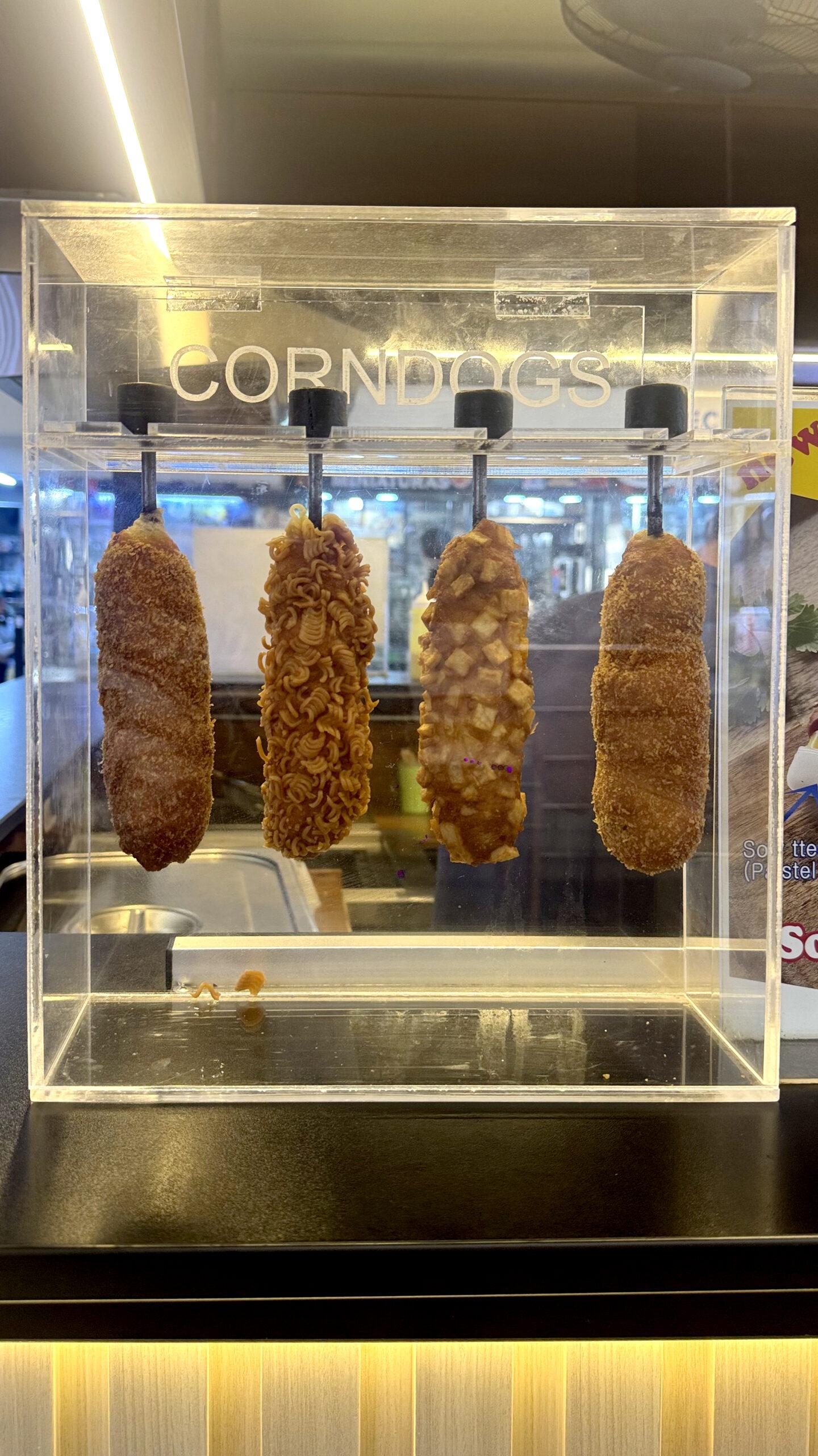 Como parte del circuito aparece el corn dog, un alimento cuyo origen es estadounidense, pero viralizado por Corea del Sur. Nació como un simple hot dog empalado en Estados Unidos, pero en Corea se transformó: cambió de tamaño, de textura, de rellenos y de forma de consumo. En Arenales, el corn dog se presenta ya atravesado por esa reinterpretación coreana: relleno de queso, cubierto de fideos, papas o simplemente empanizados. Se comen al paso y no se ofrecen como nostalgia estadounidense, sino como snack urbano coreano, adaptable al recorrido del centro comercial. Incluso en locales se ofrecen también snacks coreanos cocidos.