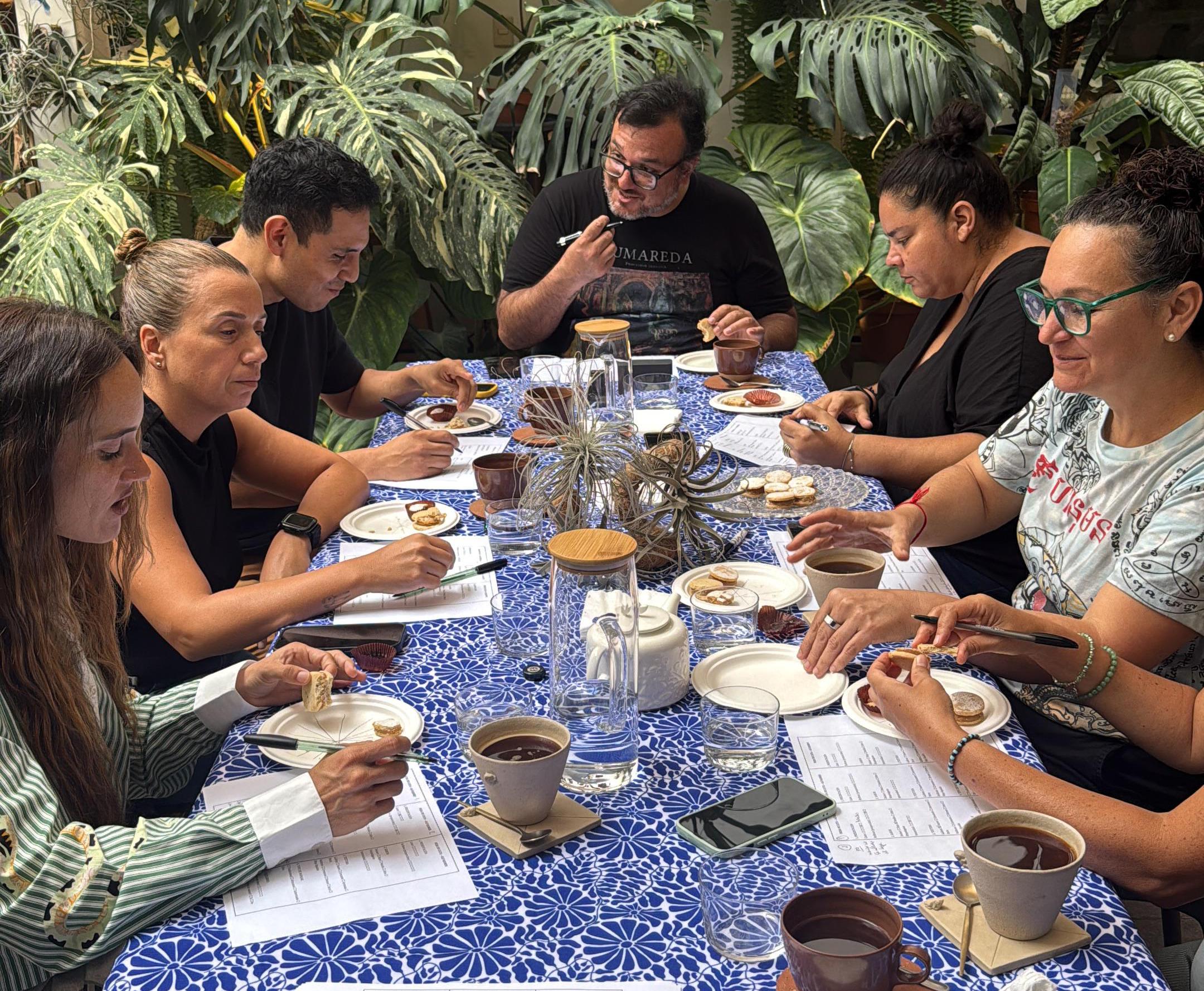 Cata trinchera. Sabina de Szyszlo de La Dulciteca, Fiorella Falco del Westin, Héctor Ibarra de GHOT PUCP, Gabriela Miglio de La Otra Harina y Karissa Becerra, directora de GHOT PUCP, junto al equipo de El Trinche en plena evaluación.