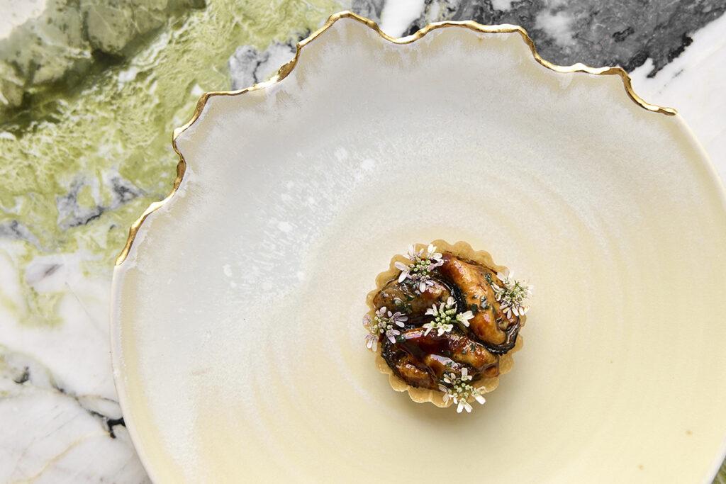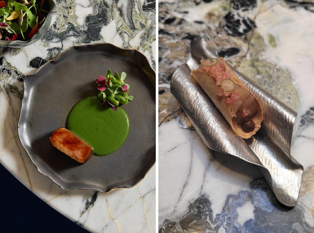 Pero vamos a la mesa. Al salón, donde rostros familiares empiezan a aparecer, tras la bienvenida de Jorge Vallejo y Alejandra Flores. La directora de sala, Mónica Oropeza; Omar Hernández, jefe de sala; y Jesús Ixta, el sommelier. Sofía Herrán está a cargo de nuestro grupo. Ha cambiado bastante el menú degustación desde la primavera del 2024, cuando de la cocina salían platos como el atún aleta azul con aguachile de brassicas (familia de las coles, brócoli, coliflor), polvo helado de wasabi y hierbas tostadas de estación; la chalupa de lengua de res con salsa de chile morita y aguacate criollo martajado, o el mango colado con arroz tostado y algas marinas, entre otros.