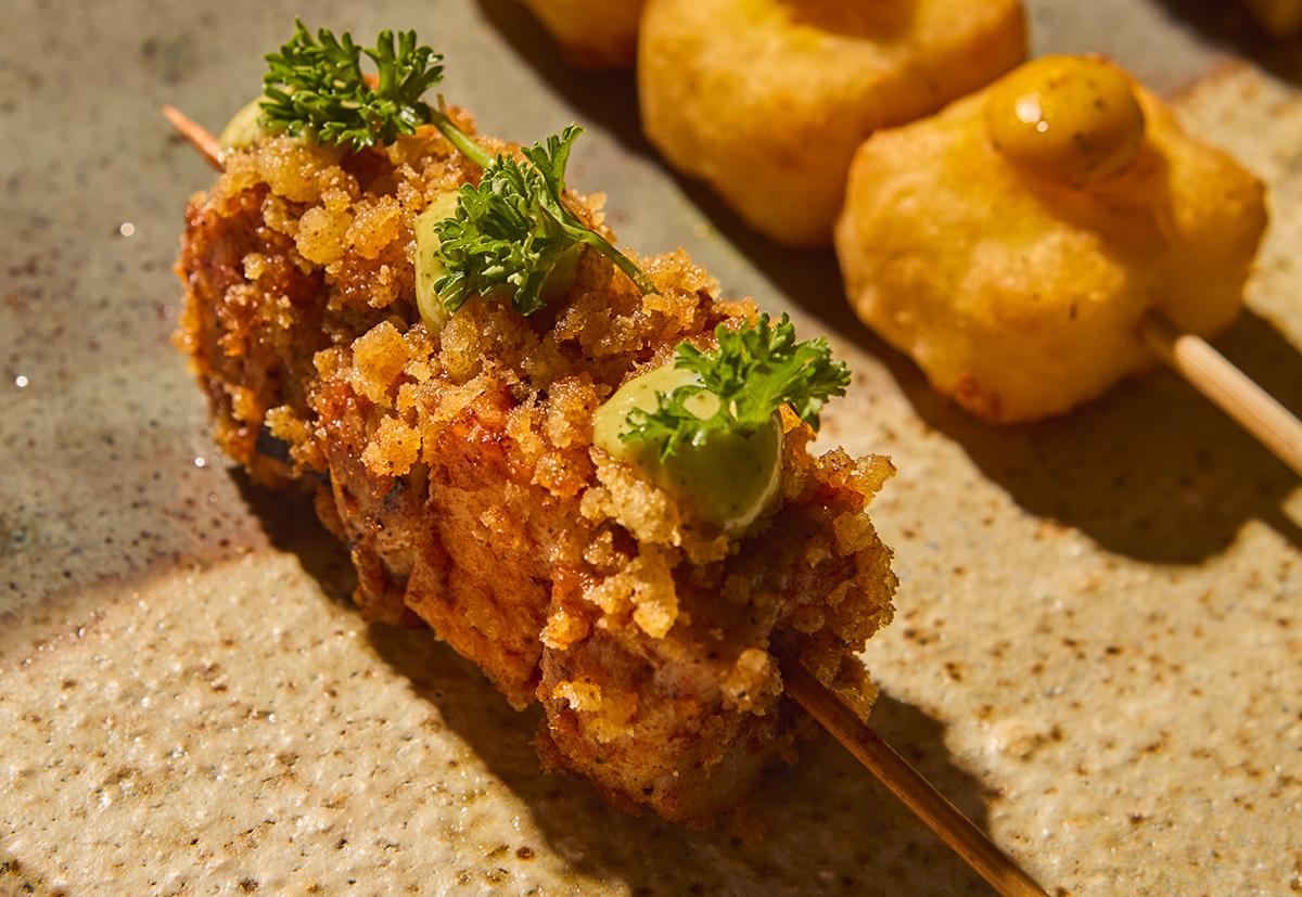 Luego llega el tataki Angus, un bife angosto curado y finamente laminado, con ponzu, cidra amazónica y chips de olluco; y el tiradito blanco, preparado con pesca del día, leche de tigre de castaña amazónica y aceite de alga codium. También probamos un langostino Jumbo, tan grande que ocupa el plato entero, cocinado al ajillo con ají mochero y una salsa de sake, otro plato que balancea perfectamente dulce, salado, ácido y picante con texturas diferentes en cada mordida. También llegó a la mesa el anticucho pulporco, un pintxo de cubos de pulpo y panceta acompañado de yuca frita y una crema de ají fermentado: tan delicioso como estético.