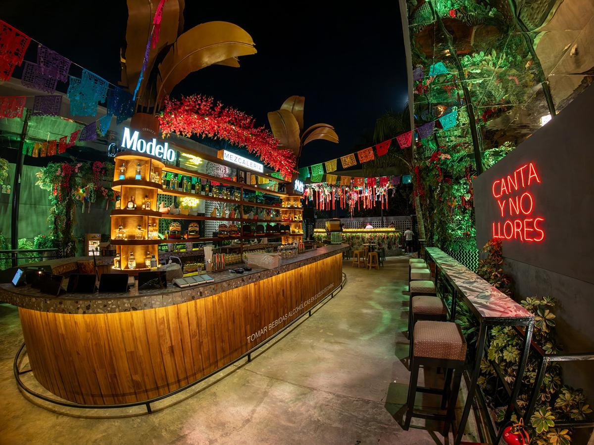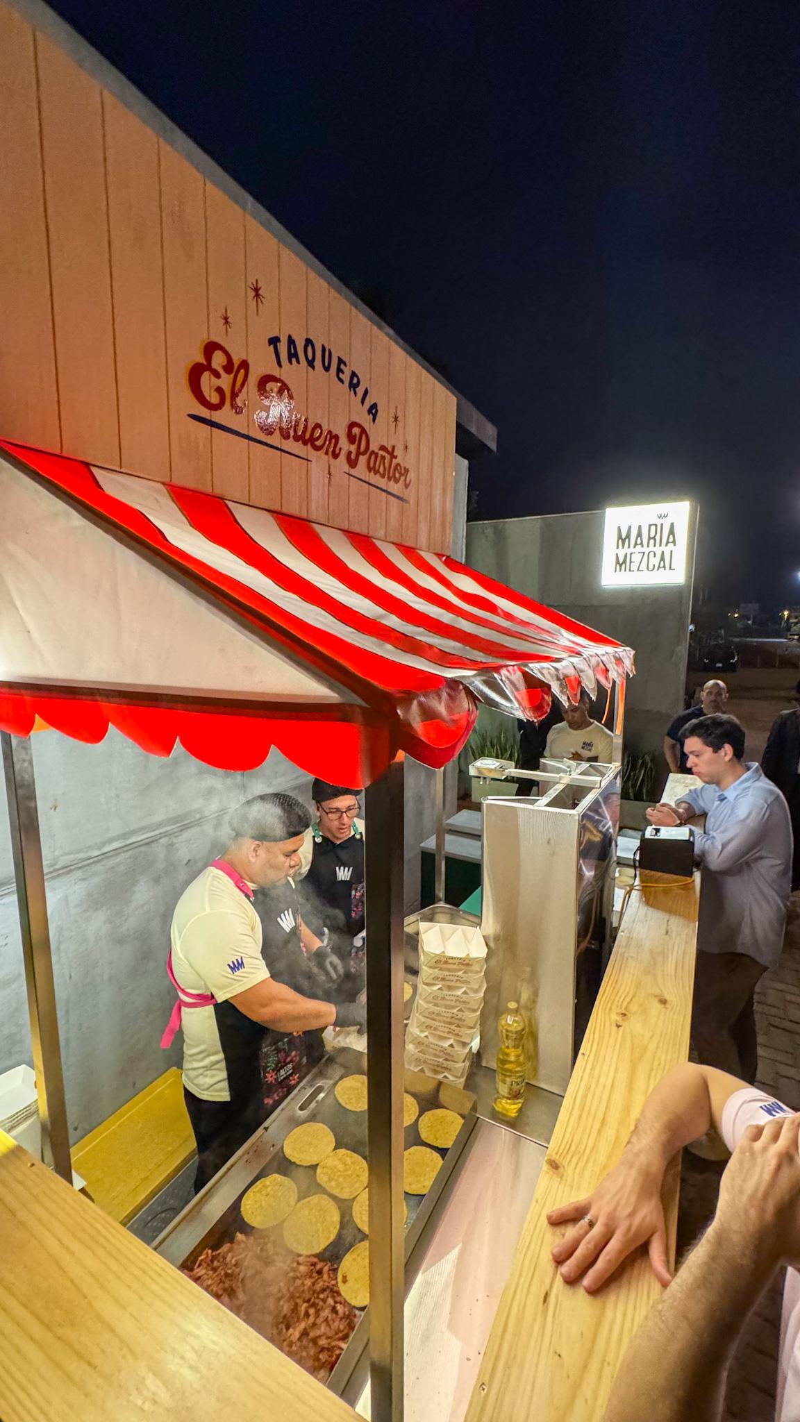 Sin perder su identidad, el formato de Asia lleva el divertido concepto de bar fuera de su contexto habitual. El local ubicado en el boulevar de Asia es una versión playera de María Mezcal, muchas flores y piñatas en un ambiente abierto tipo terraza de 250 m², cervezas mexicanas y mucho tequila. La experiencia se completa con un puesto de tacos al pastor ubicado en la entrada del local e instalado directamente sobre el boulevard. “Relajamos el lugar, pero nos gusta eso”, comenta Chung. Además de sumar comida, el puesto cumple una función sensorial clara: olor, ruido y calle desde el primer paso. “En México, los tacos al pastor son el taco del bajadón. Queríamos que eso también estuviera presente”, agrega.