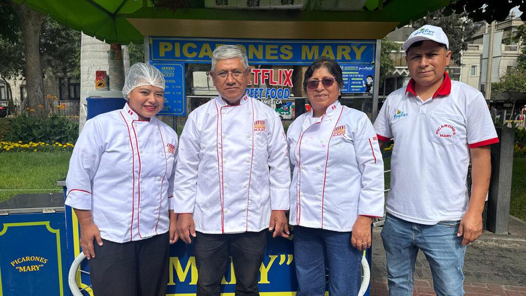 Los clientes comienzan a hacer sus pedidos en el carrito de Picarones Mary. Imposible no ver el nombre en letras doradas sobre el color azul del puesto ubicado en el parque Kennedy. Tampoco pasa desapercibido el logo de Netflix, justo debajo, en su clásico color rojo y bordes blancos. “Salimos en Netflix, pues”, dice don Pablo Valverde. Específicamente en la serie documental Street Food Latinoamérica. Conversa mientras atiende, no se hace problema, cuenta con la ayuda de sus sobrinas; una fríe y la otra cobra. Él supervisa, pero no evita meter mano a los picarones que rinden homenaje a su esposa, María Gonzales, a quien nunca veremos en el carrito porque está encargada de algo más importante: del taller de producción en su casa de Villa María del Triunfo.