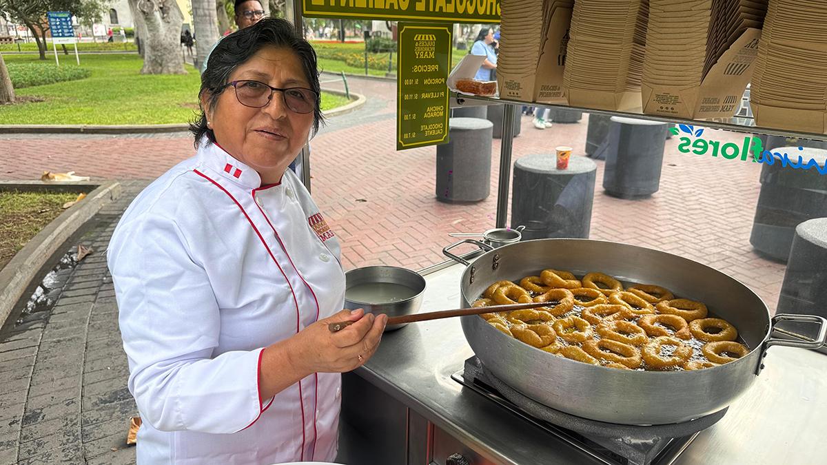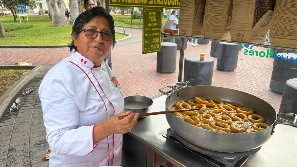 Picarones Mary. El trabajo en el taller es tan demandante como el de los puestos de Picarones Mary. En medio del parque el olor llama, les han hecho reportajes, el letrero de Netflix llama la atención de turistas y locales. En la foto, doña María Gonzales.