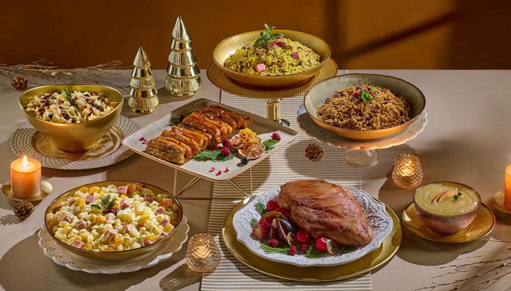 Para seis personas. Esta opción lleva un kilo y medio de pechuga de pavo, 800 gramos de panceta laqueada a la miel, 500 gramos de arroz árabe, 500 gramos de arroz pascua, 500 gramos de ensalada hawaiana y 500 gramos de Waldorf y 700 gramos de puré de manzana. El maridaje ideal es un vino blanco Dr. Loosen Riesling.