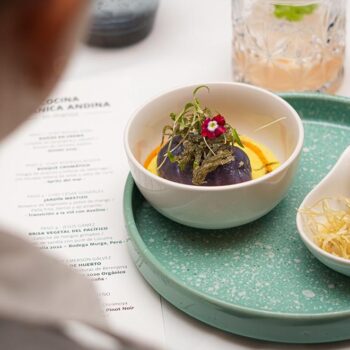 Román conoce bien lo que significa que la cocina esté fuera de la vista del comensal, los menús que responden a una planificación cuidadosa, la presión que implican las estrellas Michelin dado su paso por Le Grand Véfour y Lucas Carton, así como el trabajar para el dueño de un restaurante hasta quedar exhausto. Eso lo impulsó a plantear Awicha en sus propios términos: los platos entran y salen del menú “por que sí”, se sirve de los recuerdos y la economía familiar al utilizar, por ejemplo, patos que crían sus tíos en Huacho, o la relación con productores de la zona para hierbas y frutas. “No intento ser referente ni que mis platos lo sean. Si algo está en el menú es porque me gusta”, narra, y asegura que no siempre es sencillo explicar lo que se propone porque puede ser que hoy un plato esté disponible y cuando llegue alguien preguntando por él, no. Sin embargo, el pato es un elemento común preparado en cebiche, confitado, salteado. Luego el mar tiene preponderancia con tiraditos, tortitas, el tonno tonnato de la casa y sudados, donde conviven armoniosamente y sin pudor gastronomías de varios países, empezando por su natal Perú, India, Francia, Italia, Estados Unidos y Japón.