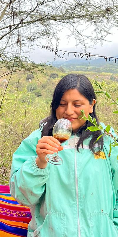 For the past eight years, or perhaps a little more, Ysabel Agustina Calderón Carlos has considered bees her best friends—the native ones from her homeland in the mountains of the rural community of San Francisco de Asís, in the district of Salas, Lambayeque. There, these bees produce a natural, sweet, and healthy liquid gold, which she promotes under the brand Sumak Kawsay, the enterprise she founded to encourage the conservation of stingless native bees and other pollinators by planting trees and restoring ecosystems through applied research and gender equity initiatives.